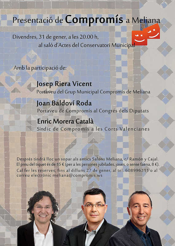Este divendres a les 20.00 h, al Conservatori Municipal, tindrà lloc la presentació de Compromís a Meliana. Hi participaran Josep Riera, portaveu del Grup Municipal Compromís, Joan Baldoví, portaveu de Compromís al Congrés, i Enric Morera, síndic de Compromís a les Corts.