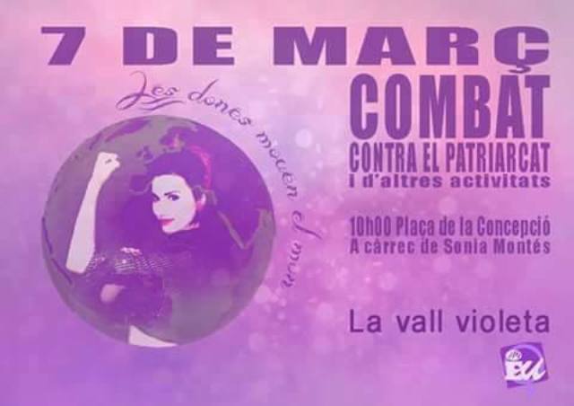 El proper dissabte 7 de març de 10:00 fins les 13:00 h es realitzarà una matinal feminista a la Plaça de la Concepció d’ Ontinyent. El col·lectiu feminista La Vall Violeta , vinculat a l’àrea de feminismes d’ EUPV, convida al conjunt de la ciutadania a participar en aquesta matinal commemorativa del Dia de la Dona.