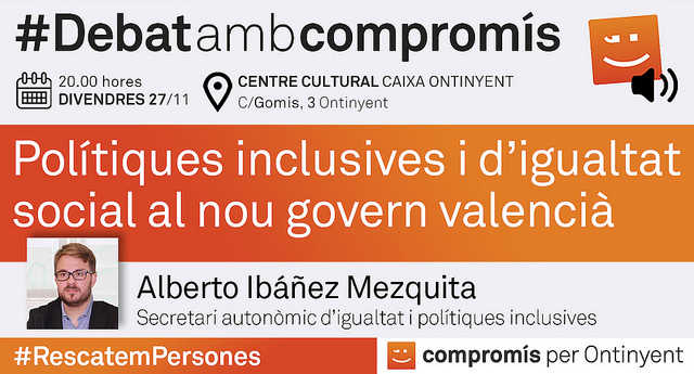 Divendres 27 de novembre a les 20h tindrà lloc el primer #debatambcompromís amb el secretari autonòmic d’Igualtat i Polítiques Inclusives, Alberto Ibáñez Mezquita. Encetem aquesta sèrie de jornades obertes a la ciutadania parlant de “Polítiques inclusives i d’igualtat social al govern valencià”. Aquest debat tindrà lloc al Centre Cultural Caixa Ontinyent del carrer Maians.