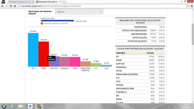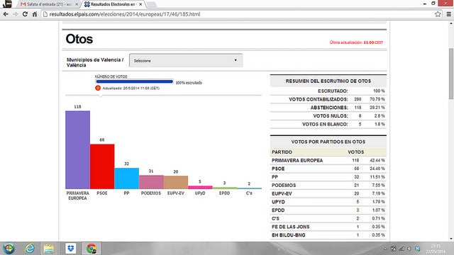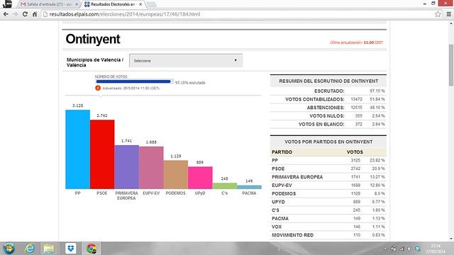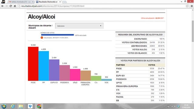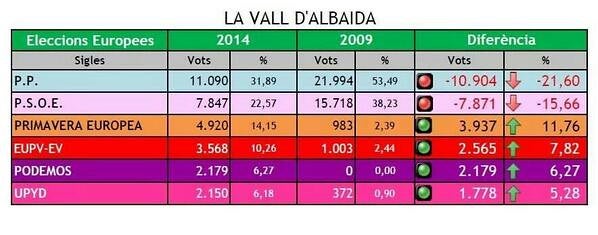 En resum, som la tercera força i tenim l’increment més gran dels vots aconseguits (de 332 en 2009 a 1.791) , cal destacar sobre tot la espectacular davallada de PP i PSOE, sent cridanera la d’aquest últim ja que en ciutats com Xirivella o la propera Alcoi al tenir el govern com ací han guanyat les eleccions, tanmateix ací han perdut la meitat de vots al igual que el PP, serà la fi del bipartidisme?