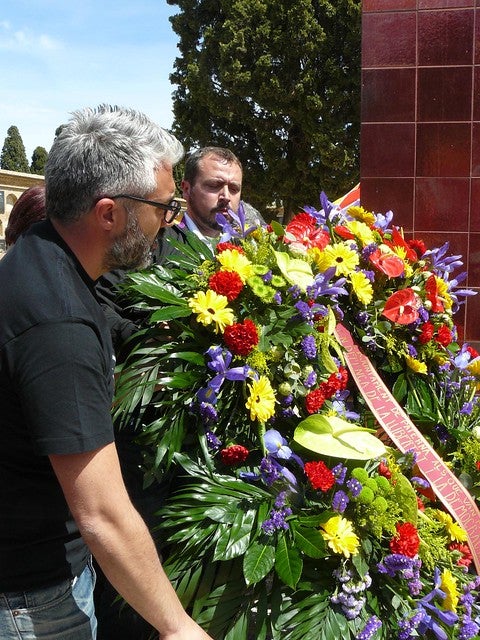 Ramón explica que “després de veure que la corona es quedava a soles a l’entrada del cementeri, entre el portaveu d’Esquerra Unida, Javier Parra, i jo mateix l’hem dut i l’hem dipositada amb les altres flors de l’homenatge als afusellats. L’alcaldessa ja havia desaparegut, demostrant una total falta de respecte a les víctimes del genocidi franquista”.