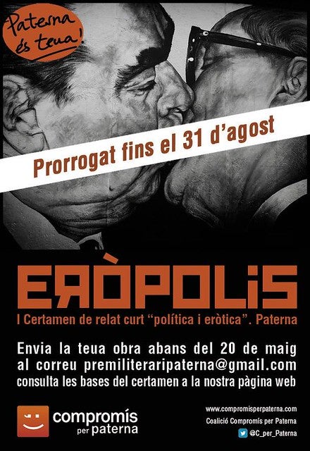 Dins la campanya de promoció dels valors culturals de Paterna “Paterna és teua!”, Compromís va convocar el passat mes d’abril el I Certamen de relat curt, política i eròtica, “Eròpolis”. Ara, una vegada finalitzada la votació, l’obra “No puc ser jo” de Rafael Garcerà ha resultat guanyadora amb un total de 289 vots emesos a través del facebook de la coalició d’esquerres. L’obra guanyadora rebrà un premi de 300 euros en metàl·lic.