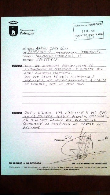 Després d’haver informat el seu col·leciu el passat 1 de juliol, el regidor de Compromís per Pedreguer, Antoni Costa ha presentat a l’Ajuntament la seua renúncia a l’acta de Regidor, tal i com diu en la instància, “per raons de caire professional i familiars”.