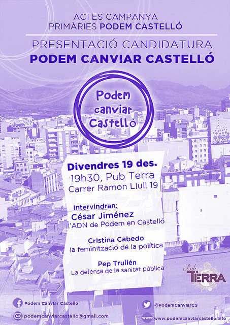 Podem Canviar Castelló explicarà el seu projecte per a provocar una transformació també en el panorama polític municipal demà divendres 19 de desembre a les 19h 30 en el Pub Terra (Carrer Ramon Llull, 19), un dels pubs més emblemàtics de Castelló. El candidat a Secretari General de la candidatura, César Jiménez, explicarà com traslladar l’ADN de Podem a la nostra ciutat.