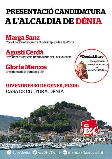 El proper divendres 30 de gener EU-Dénia farà la presentació de la persona triada per la militància i els simpatitzants d’EUPV a Dénia, per encapçalar el projecte de l’esquerra de Dénia.
