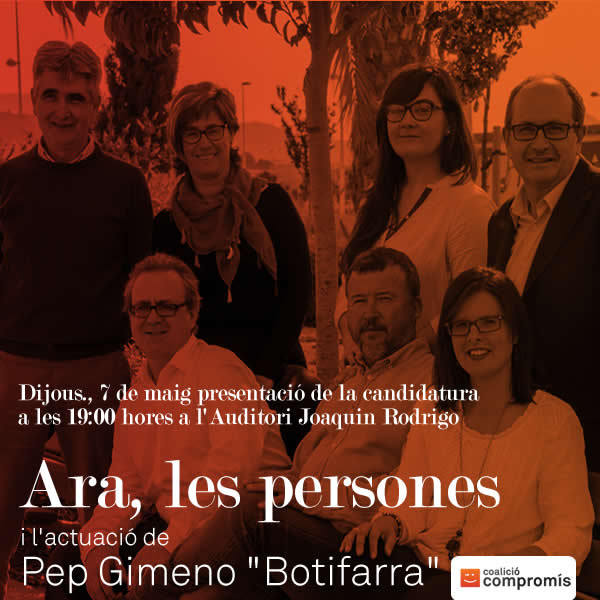 També és presentarà el programa electoral ARA, LES PERSONES 2015-2019. Els projectes de Compromís seran els projectes dels ciutadans. Alguns seran projectes nous i altres són projectes pendents, i tots tindran la finalitat de contribuir a la millora en les condicions de vida de la societat. Per exemple potenciar el teixit industrial creant a Parc Sagunt una àrea vinculada a les noves tecnologies amb la participació de la Generalitat i la Universitat. Evidentment anem a insistir en el nostre projecte de port marítim diversificat, amb més autonomia de gestió i obert a la ciutat. Un sector que necessita idees és el del patrimoni i com ja vam plantejar en l’anterior legislatura cal insistir en la projecció internacional presentant la candidatura de Sagunt a la llista de Patrimoni de la Humanitat en la categoria de lloc històric. Sense oblidar molts altres projectes concrets en tots els àmbits de l’acció municipal, com la Gerència o el parc de Sant Cristòfol.
