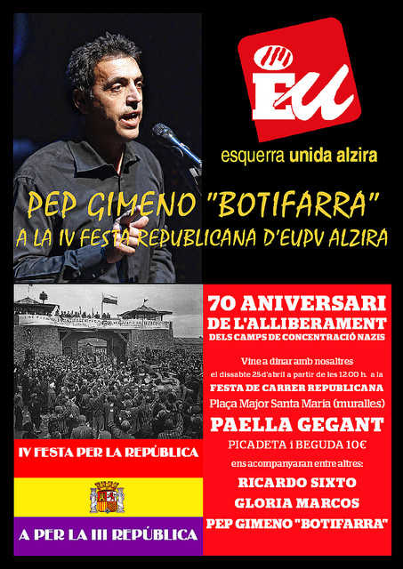 Seguidament, i commemorant la proclamació de la República, EU-Alzira organitza, com ve fent any a any, un dinar popular amb paella gegant, per a totes i tots qui vulguen adquirir els tíckets. A més a més, enguany se celebra el 70 aniversari de l’alliberament dels camps d’extermini nazis, on estigueren presoners milers de republicans, també alzirenys. Es comptarà amb la presència de Glòria Marcos, presidenta de la Fundació d’Instituts d’Estudis Polítics, que va coordinar una unitat didàctica al respecte.
