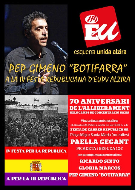 Seguidament, i commemorant la proclamació de la República, EU-Alzira organitza, com ve fent any a any, un dinar popular amb paella gegant, per a totes i tots qui vulguen adquirir els tíckets. A més a més, enguany se celebra el 70 aniversari de l’alliberament dels camps d’extermini nazis, on estigueren presoners milers de republicans, també alzirenys. Es comptarà amb la presència de Glòria Marcos, presidenta de la Fundació d’Instituts d’Estudis Polítics, que va coordinar una unitat didàctica al respecte.