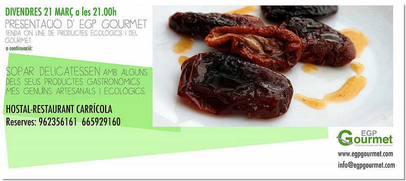 L’Hostal Restaurant Carrícola elabora el divendres 21 de març un menú delicatessen amb motiu de la presentació de la empresa EGP Gourmet – www.egpgourmet.com de venda i distribució de productes ecològics i del gourmet online.