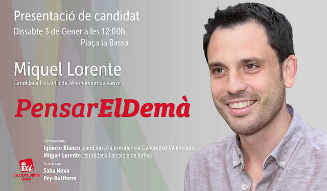 El proper dissabte, 3 de gener de 2015, a les 12:00 hores en la plaça la Bassa junt a la seu d’EU Xàtiva tindrà lloc la presentació de Miquel Lorente com a candidat a l’alcaldia de Xàtiva per EU.
