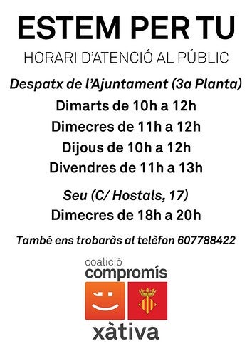 També s’ha habilitat un horari d’atenció en el despatx de l’Ajuntament a la tercera planta pels matins, de dimarts a divendres, i en la seu del carrer Hostals els dimecres de vesprada de 18 a 20h, per tal que la ciutadania puga fer arribar les propostes personalment, o qualsevol informació que necessite del col·lectiu. A més, a través dels perfils en les diferents xarxes socials (Facebook oTwitter) i el correu electrònic es poden remetre missatges públics o privats per a qualsevol proposta o demanda.