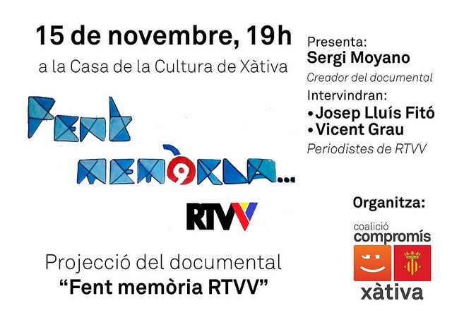 Aquest dissabte 15 de novembre, i a les 19h, tindrà lloc a la Casa de Cultura de Xàtiva la projecció del documental “Fent memòria… RTVV”, organitzada per Compromís Xàtiva i que comptarà amb la presència de Sergi Moyano, un dels autors del documental, i dels periodistes de RTVV i coneguts xativins, Vicent Grau i Josep Lluís Fitó, que comentaran la seua experiència en RTVV.