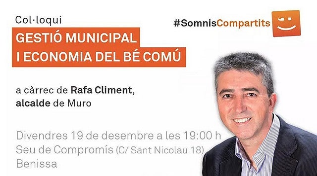 El pròxim divendres 19 de desembre a les 19.00 hores estarà a Benissa a la nova seu de Compromís (carrer Sant Nicolau, 18) per a parlar i conversar sobre la gestió local i l’Economia del Bé Comú.