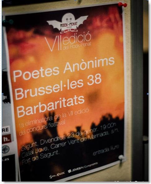 La ciutat de Sagunt va acollir la passada nit del divendres 26 de gener a Barbaritats (Xàtiva), Brussel·les 38 (Borriana) i Poetes Anònims (València). Després d’una intensa nit de rock i altres estils, es van classificar per a la final Barbaritats, amb una proposta eclèctica que combina diversos ritmes com el funky. Ara, els cinc integrants es veuran les cares a la final de Vila-real en la resta de grups, aquells que guanyen a Benciarló ( 30 de gener) i Almassora (06 de febrer).