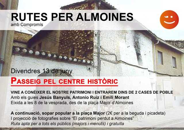 Després de la ruta, té lloc a la plaça Major un sopar popular, on està convidat tot el poble. I es projecten fotografies del patrimoni perdut d’Almoines.