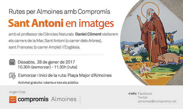 El col·lectiu de Compromís per Almoines ha volgut col·laborar en els actes de la celebració de la festivitat de Sant Antoni que s’organitzen a la població amb una ruta pels carrers del municipi per conéixer la figura del sant i els llocs relacionats amb la història de la festa.