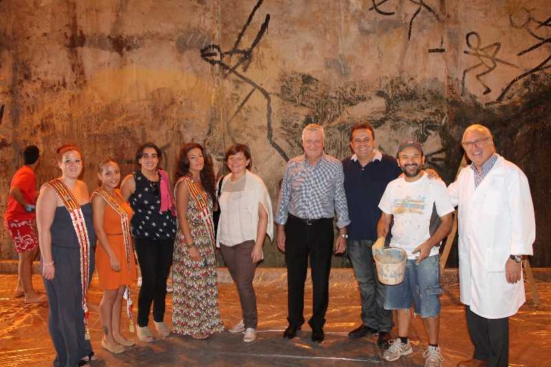 Des de les 9 del matí, alumnes i amics de l’Escola s’han desplaçat fins al lloc per a col·laborar en l’elaboració d’esta obra d’art de grans dimensions, uns 400 metres quadrats, “consistent en una simulació de pintures rupestres, en les quals es reflectix que, ja en el Neolític, es va produir el descobriment de la paella en Sueca; i hem aprofitat totes les textures de la paret, el formigó, l’aigua que es filtra… per a donar-li un major realisme”, ha explicat en to divertit el director de l’Escola d’Art Escultor Beltrán, Juan Antonio Llopis.