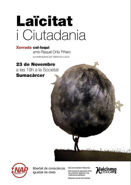 El pròxim dilluns dia 23 de novembre a les 19h, tindrà lloc al local de “La Societat” de Sumacàrcer, una xerrada-col·loqui de la mà de Raquel Ortiz Piñero, coordinadora de Valencia Laica i experta en la problemàtica de separació entre institucions públiques i creences religioses. Nova Alternativa Progressista proposa aquesta activitat com a introducció a la idea de laïcisme i la importància que ha de tenir dins de l’àmbit públic.