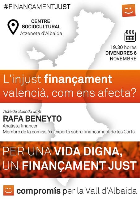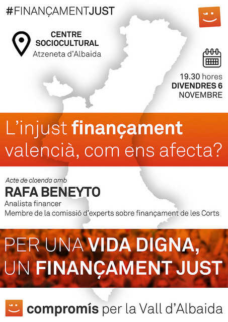 Des de Compromís i Joves amb Compromís per la Vall d’Albaida es va començar una campanya de conscienciació sobre el nefast model de finançament autonòmic i inversions territorialitzades que pateixen els valencians i valencianes. La campanya ha tingut una incidència important a les xarxes socials, gràcies a la col·laboració de totes les persones i col·lectius que han compartit les diverses infografies que s’han anat elaborant des de l’equip de comunicació de les dues executives. Des del primer moment, la voluntat ha estat en detallar les ‘dades de l’impacte de l’infrafinançament a la comarca’, en base als estudis realitzats per la comissió d’experts de les Corts i a l’informe elaborat per l’economista i regidor de Compromís a Benigànim, Joan Sanchis. Segons aquestes dades, a la Vall d’Albaida li correspondria d’ingressar cada any 20 milions d’euros més en concepte de transferències i 51 milions en despesa pública.