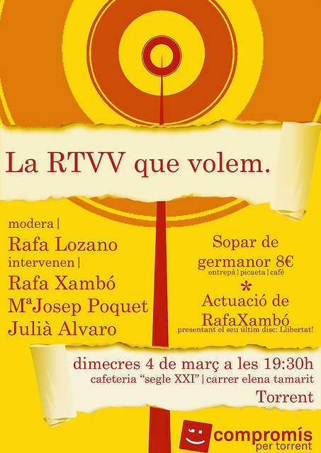 És per això que Compromís per Torrent ha organitzat una xarrada-debat públic per al proper dimecres 4 de març que tindrà lloc a partir de les 19.30h en la Cafeteria “Segle XXI” en el carrer d’Elena Tamarit –al costat de la Font de les Granotes- i que comptarà amb la participació de Rafa Xambó, professor de Periodisme i representant de Compromís al Consell de RTVV; i els treballadors de RTVV Julià Àlvaro i Maria Josep Poquet. El debat estarà moderat per Rafa Lozano, també treballador de RTVV i membre de Compromís per Torrent.