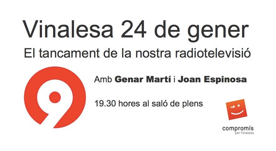 El pròxim divendres 24 de gener, a les 19.30 hores, en el saló de plens, el BLOC Compromís de Vinalesa organitzem una taula redona per tractar el tancament de radiotelevisió valenciana i les seues conseqüències. Comptarem amb la presència del periodista Genar Martí (Societat Anònima) i del presentador de Notícies 9, Joan Espinosa.