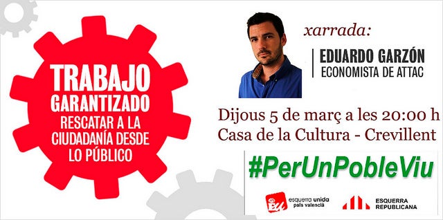 La coalició Esquerra Unida-Esquerra Republicana organitza una xarrada sobre “Treball Garantit”, a càrrec de l’ economista Eduardo Garzón. L’acte tindrà lloc a la Casa de Cultura el dijous 5 de març a les 20 hores.
