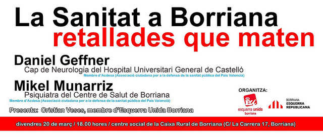 Esquerra Unida Borriana – Esquerra Republicana Borriana han programat per al pròxim divendres 20 de març, a partir de les 18.00 hores, una xerrada sobre l’estat de la Sanitat a Borriana.