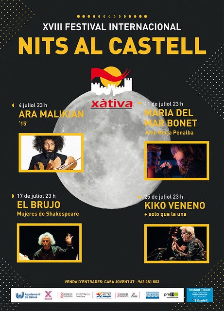 L’alcalde Roger Cerdà i la tinent d’alcalde Cristina Suñer, responsable de l’organització d’aquesta edició, han presentat aquest matí el cartell del XVIII Festival Nits al Castell de Xàtiva. A la roda de premsa de presentació també ha assistit el nou director artístic del festival, Rafael Jordán. L’elenc d’enguany està conformat pel violinista Ara Mailikian, l’actor Rafael Álvarez el Brujo i els cantants Mª del Mar Bonet i Kiko Veneno.