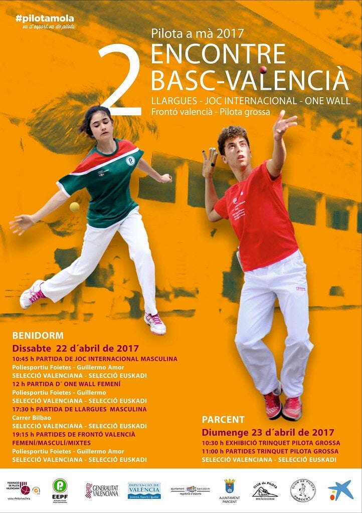 El cap de setmana del 22 i 23 d’abril tindrà lloc el II encontre basc-valencià de pilota entre equips de diferents modalitats i categories de les seleccions valenciana i basca. La trobada consistirà en dues jornades: la primera, el dia 22, a Benidorm i la segona, el 23, a Parcent. Durant aquests dies es realitzaran diferents partides de One Wall -el joc internacional-, llargues, frontó i pilota grossa. Els pilotaris tindran l’oportunitat de compartir experiències amb esportistes d’un altre territori, però que també viuen la pilota a mà en el dia a dia.