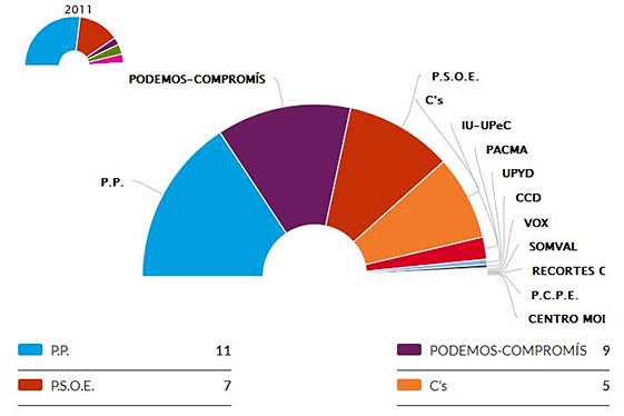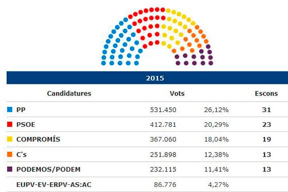 El PP aconsegueix 11 dels 20 diputats que tenia amb el 31,17% dels vots, Compromís-Podemos obté 9 escons i el 25,0% dels vots, PSPV 7, passa a ser la tercera força amb 20,35% i 311.485 vots; Ciudadanos es queda amb 5 escons i el 15,66% dels sufragis i EUPV-UP no obtindria representació.