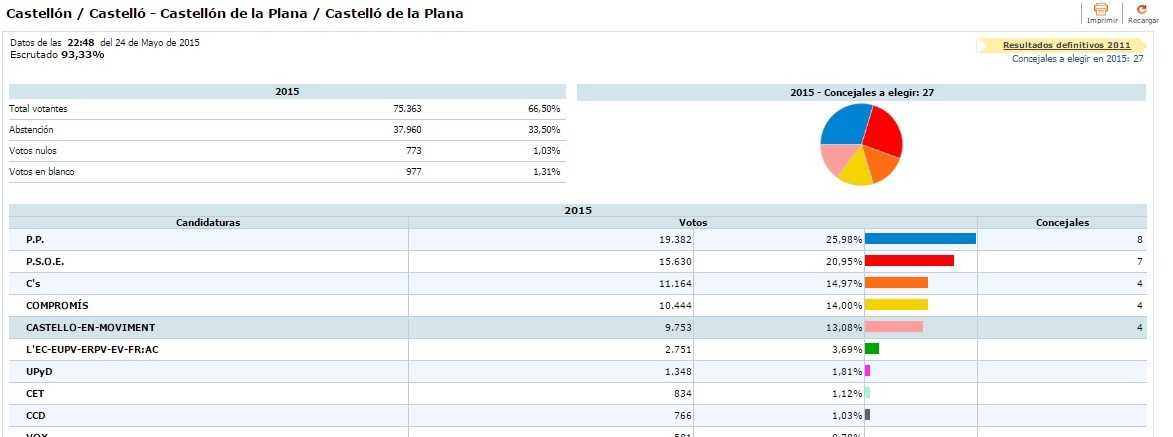 A la ciutat de Castelló, en les eleccions de 2011, el PP va aconseguir 15 regidors, el PSPV 9 regidors, Compromís 2 regidors i EUPV un.