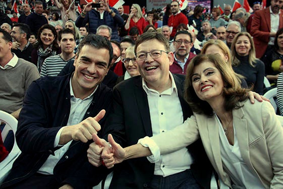 I com que diners, o poder, alegren els infants, costà una mica desxifrar que eixa veu entusiasmada, aguda i febril eixira d’una gola de 56 anys, la de Ximo Puig, un escolà a la trona que recità sense màcula les bondats de la doctrina socialista. Abans, la cap de llista per València, Ana Botella, havia enlairat la papereta del vot com un sant Joan de Ribera aixecant la creu per fer fugir els moros. I encara que els 9.000 no doblegaren el genoll, hi hagué aplaudiments amb una pujada de decibels considerable. “Ramón Rubial, Pablo Iglesias, Indalecio Prieto, Max Aub, Felipe, Zapatero…”, recità Puig el santoral socialista amb bona nota. I, a continuació, tirà mà d’expedient: “El primer reial decret que vaig firmar fou tornar la tarjeta sanitària a tothom i després aproví una moratòria amb els desnonaments. I este serà el primer curs que els xiquets tinguen llibres gratuïts”.