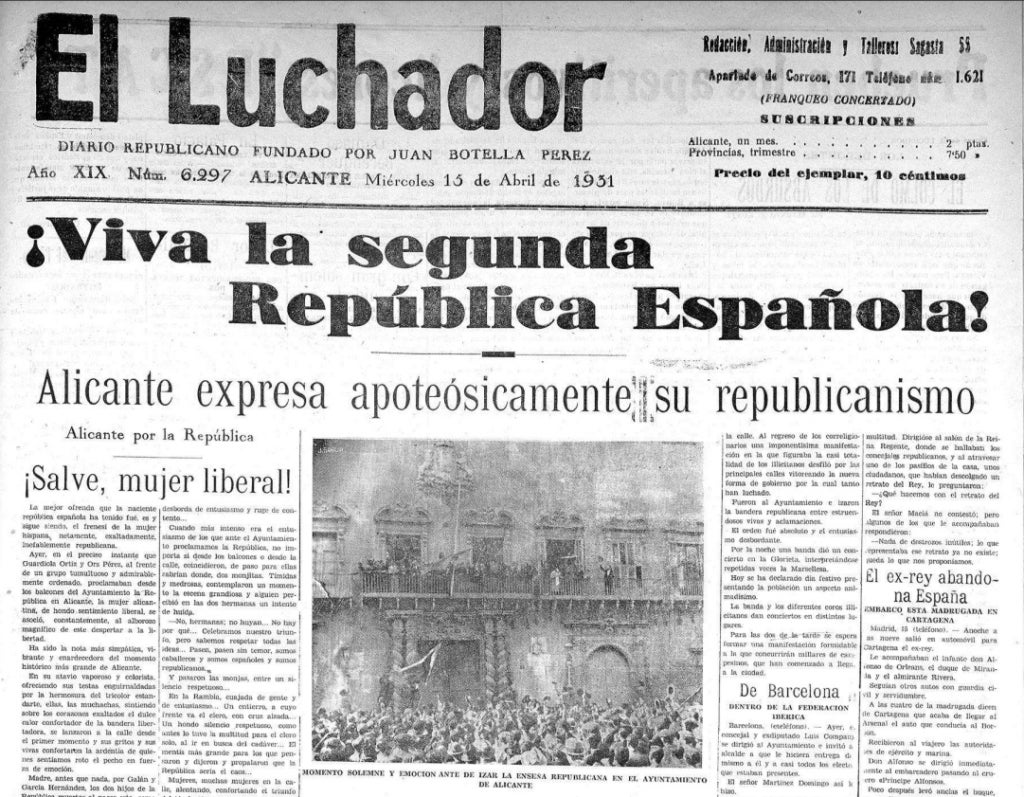 El 14 d’abril de 1931, hui mateix fa 93 anys, es va proclamar la II República espanyola. Alacant també es va sumar a les proclamacions que van fer diverses ciutats a través dels seus ajuntaments, que van canviar la bandera espanyola monàrquica per la tricolor. Dos dies abans, el 12 d’abril, s’havien celebrat eleccions municipals amb un resultat favorable a les candidatures republicanes, sobretot a les grans ciutats. Aquell va ser el detonant del canvi i Alacant, que va ser fidel a la República fins a l’últim dia –va ser l’última capital de demarcació a ser conquerida per les tropes franquistes el 30 de març del 1939, dos dies abans que Franco donara la guerra per acabada–, no en va ser una excepció.
