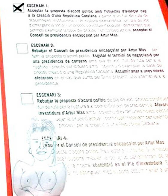 L’empat sonat que es va produir ahir a l’assemblea de la CUP celebrada a Sabadell hagués pogut tenir un desenllaç totalment diferent si no s’hagués comptabilitzat com a nul un vot que seleccionava la primera opció (sí a Mas i sí a l’acord amb JpSí) però que tenia una caricatura d’Anna Gabriel en ‘top less’. Un cop descartada aquesta papereta, es va produir l’empat tècnic de 1.515 vots per a cada opció. Aquest va ser el vot de la discòrdia que va produir que els dirigents de la CUP tardessin tant alhora d’exposar els resultats, tant a la militància com a la roda de premsa.