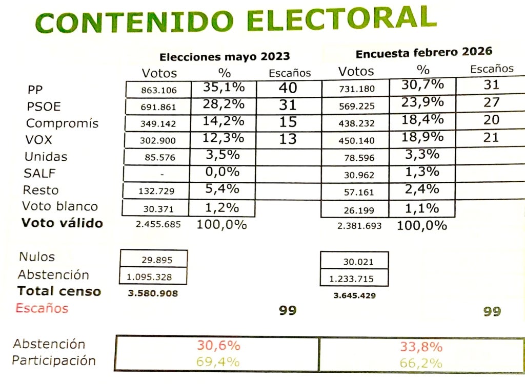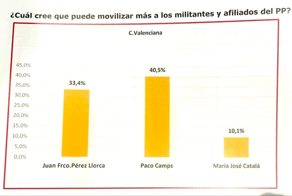 Així ho ha manifestat en una compareixença en la qual ha presentat una enquesta encarregada per ell a NC Report sobre la situació política del País Valencià i les perspectives orgàniques i electorals del PP valencià. Segons aquesta enquesta, que ha fet 1.500 entrevistes entre el 2 i el 18 de febrer, Camps seria el “més capaç de revitalitzar el PP” i de mobilitzar militants i afiliats enfront de Llorca i Catalá, així com també el que més podria “atraure” votants de Vox.