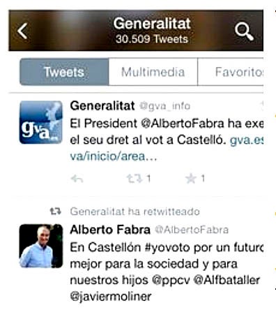 La coalició ha assenyalat que han sigut els internautes els qui els han donat “la veu d’alarma” en veure que des del compte oficial de la Generalitat es retuitaven les publicacions de Fabra, qui feia públic que havia anat a votar i donava el seu “exprés” suport al PP valencià, al candidat a l’alcaldia de Castelló, Alfonso Bataller i al president en funcions de la corporació castellonenca, Javier Moliner.