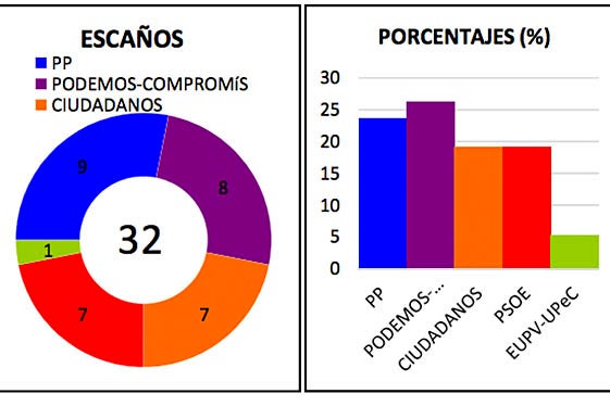 La candidatura de Compromís-Podemos obté el 26,2 per cent dels vots i supera el PP (23,7%), Ciudadanos (19,1%) PSPV (19,1%) i EUPV-UP (5,3%).