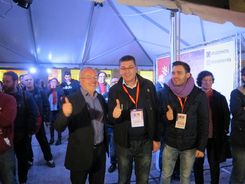 En l’exterior, pendents de la pantalla de televisió s’ha pogut veure el síndic de Podem en les Corts, Antonio Montiel, el portaveu de Compromís, Fran Ferri, i el portaveu de Compromís i president de les Corts, Enric Morera, que s’han fos en una abraçada en conèixer que Podem se situa com a tercera força segons els sondejos a nivell estatal.