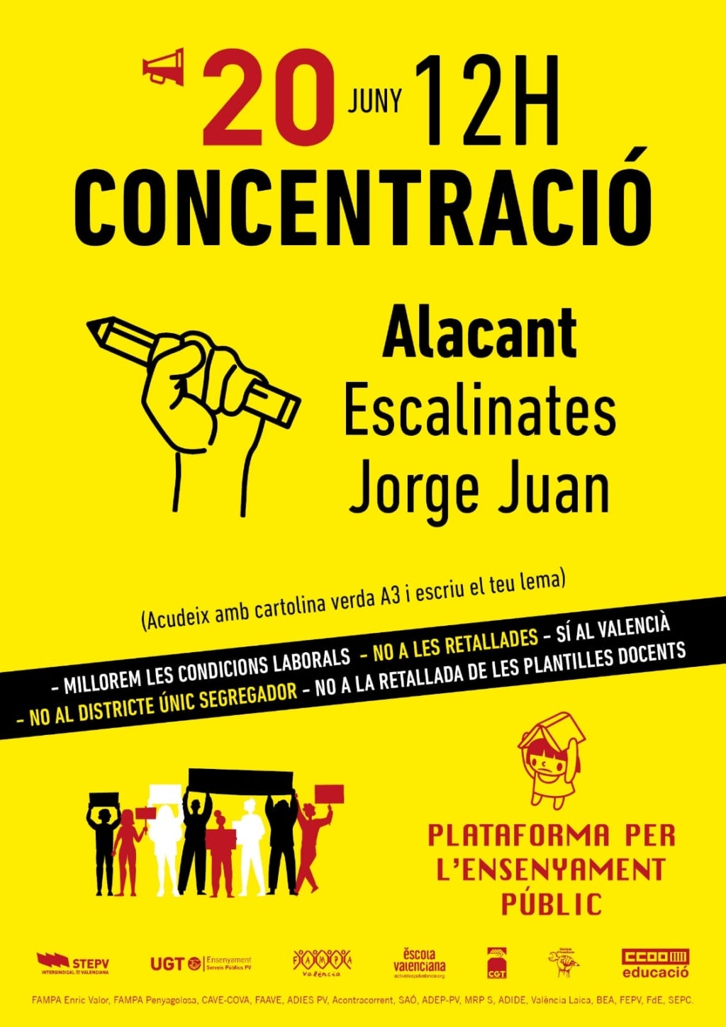 Aquest acte, convocat en el context de les festes de les Fogueres de Sant Joan, s’organitza per a «continuar reclamant l’anul·lació del districte únic segregador, per la retirada de la proposta de llei d’arraconament del valencià, per la fi de les retallades a les Escoles Oficials d’Idiomes i en infantil i primària i de plantilles, per la negociació de les millores laborals i per la no execució del concurs de trasllats en Secundària i altres casos».