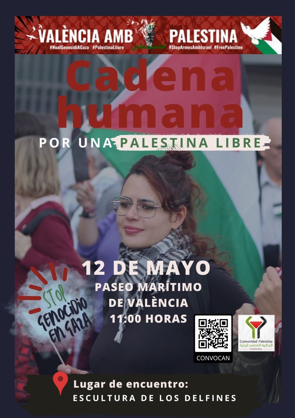 La Plataforma València amb Palestina ha convocat la ciutadania a participar en la «cadena humana per Palestina lliure» que es formarà aquest diumenge dia 12 de maig a les 11.30 del matí al passeig marítim de València, a tocar de les estàtues dels dofins.