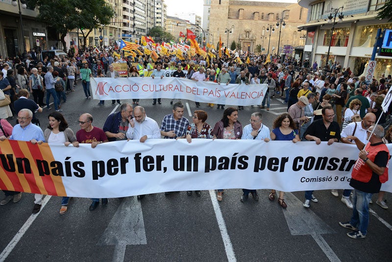 Milers de persones han omplert els carrers de València en una manifestació més multitudinària que la de l’any passat, segons els organitzadors. La Comissió 9 d’Octubre, coordinada per ACPV, ha aplegat enguany PSPV-PSOE, Compromís, Podem, EUPV, ERPV i Els Verds, a més de sindicats i entitats, “expressant una voluntat de consens per avantposar els interessos dels valencians als interessos de partit”.