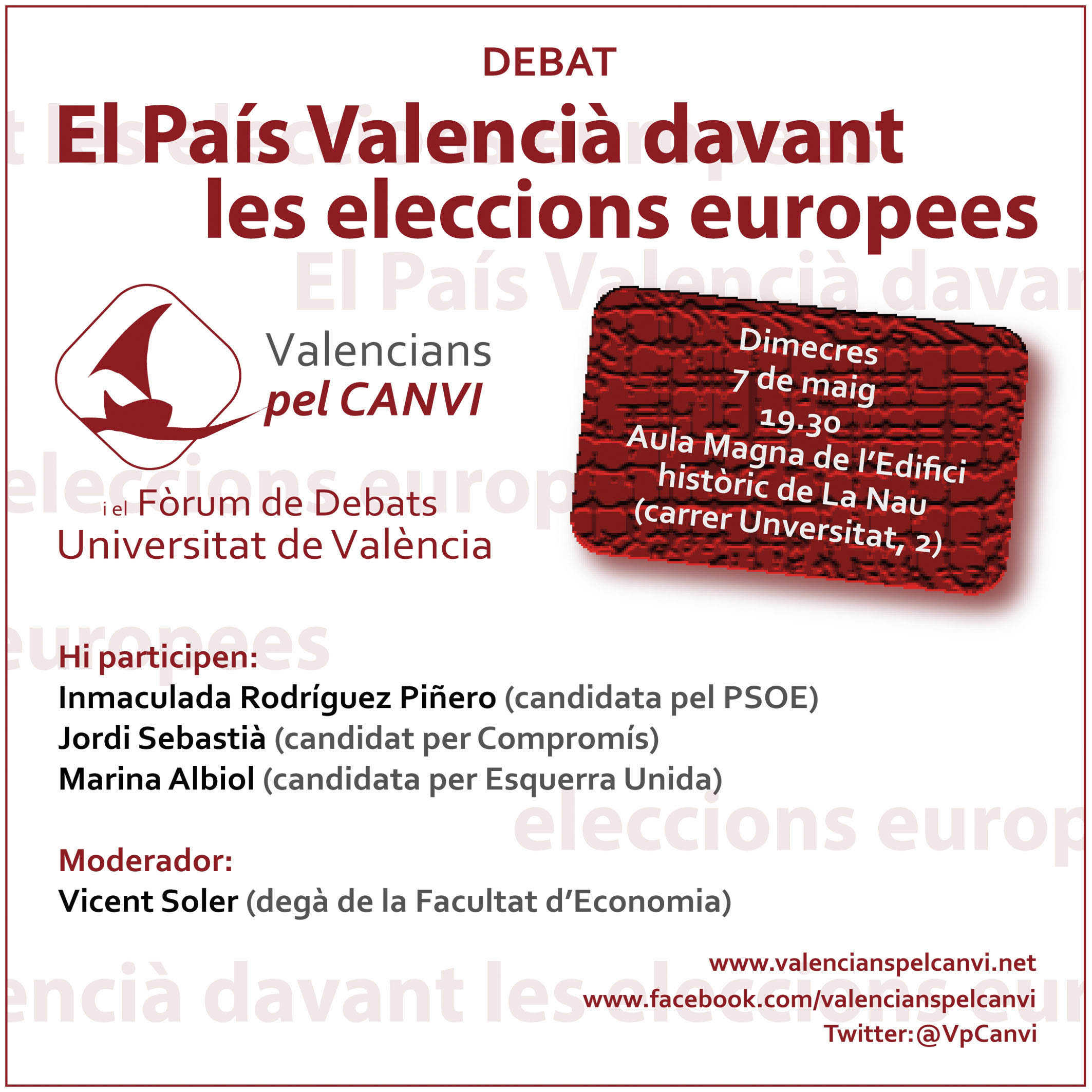 ‘El País Valencià davant les eleccions europees’ és el títol d’una taula redona, prevista per a aquest dimecres, 7 de maig, organitzada per Valencians pel Canvi i el Fòrum de Debats de la Universitat de València.
