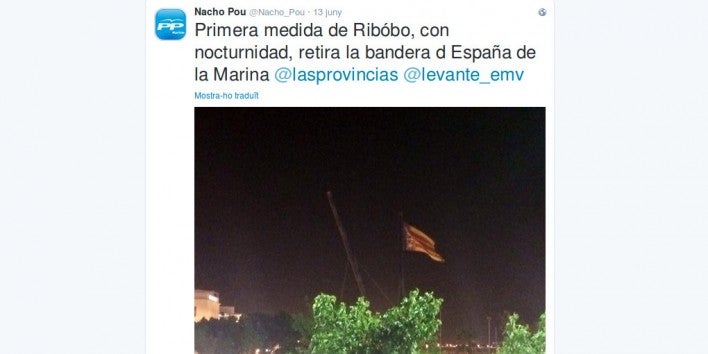 Dos assessors del PP, Luis Salom i Nacho Pou, no van tardar ni 24 hores des de la investidura de Joan Ribó al capdavant de l’Ajuntament de València per posar llenya al foc contra el nou govern. El dissabte a la nit van fer córrer una fotografia de la Marina Reial de València on es podien veure dues astes i només una bandera, la de València. Nacho Pou publicava al Twitter: “Primera mesura de Ribó, amb nocturnitat, retira la bandera d’Espanya de la Marina”, tot i que resulta que la tempesta de la vesprada l’havia deixat enrotllada al pal i des de lluny la bandera no era visible.