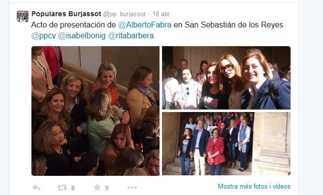 En una piulada del dia 18 d’abril, que encara és visible al compte @pp_burjassot, apareixen diverses fotografies de la candidata a l’alcaldia de Burjassot, Sonia Cassaus, i altres militants a Sant Miquel dels Reis, durant l’acte de presentació d’Alberto Fabra com a candidat a la Presidència de la Generalitat.
