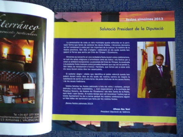 L’article del president de la Diputació apareix al llibre de festes en una pàgina a color i amb una fotografia, però el contingut de l’escrit no diu res. “És una pàgina completament desaprofitada. La pregunta és si el president de la Diputació l’ha pagada com a publicitat, de la seua butxaca o dels fons de l’entitat provincial”, es pregunten.