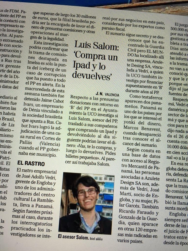 «Hem llegit dins dels sumaris de la UCO algunes intervencions d’un tal Luis Salom que els sonarà bastant, que diuen ‘tu vas, ho compres i ho tornes’ respecte a unes taules, ‘i després que t’ho tornen amb bitllets menuts i així tot queda tranquil’. Hui és assessor del Partit Popular».