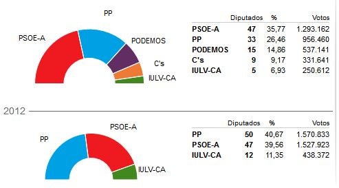 D’altra banda la irrupció de Podem no és tan espectacular com li donaven les enquestas i sondejos, mentre que el partit d’Albert Rivera entra amb força en el parlament andalús.