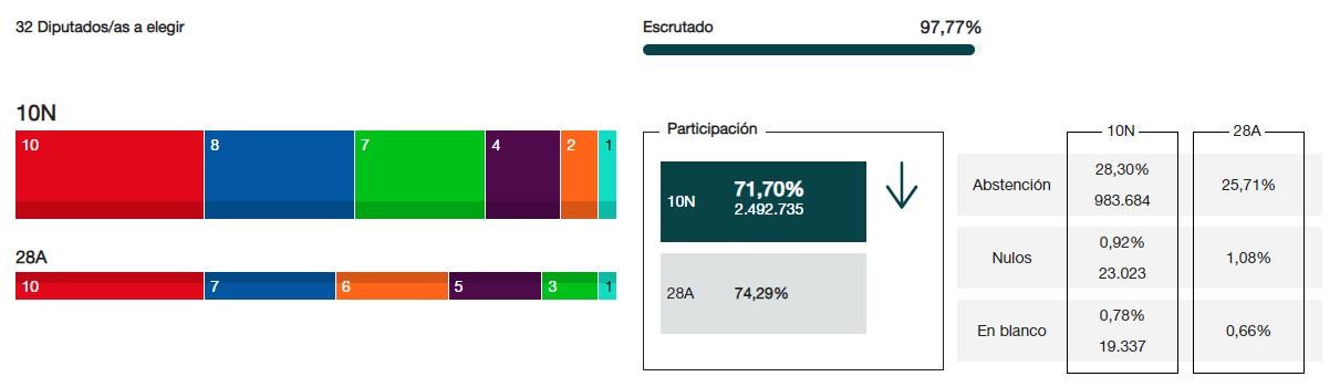 Unides Podem perd un diputat i es queda amb 4, mentre que Ciutadans perd quatre escons i es queda amb 2. Més Compromís manté la seua representació, amb un escó. Així, la coalició amb Més País no aporta més diputats a la formació valencianista.