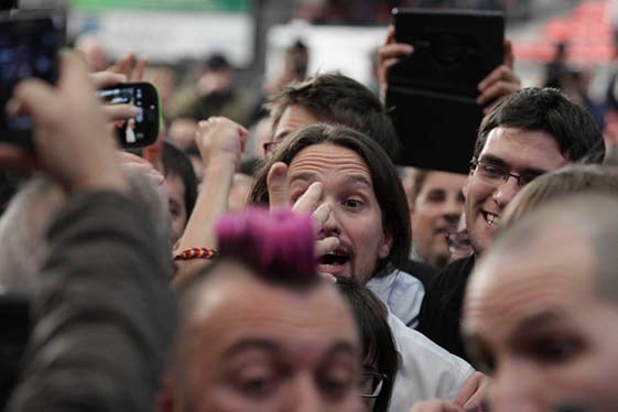 De fet, fou un acte monolític, sense escletxes ni risc. No hi hagué propostes. Només consigna. El que està bé i el que està malament. “Ells són casta, màfia, golfos, gent vella. I nosaltres dignes, lliures i del poble. Ells, a dalt. Nosaltres, a sota.” I qui són ells? Només Rajoy? Només el PP? Potser els que no hi eren allí? Ningú no aclarí la controvèrsia del pronom. Però com que la veritat té una sola porta però que s’obri moltes vegades, Iglesias animà la gent a acudir en massa el 31 de gener a la marxa dels camises morades a Madrid. De Cibeles a Sol, com en un xotis. “El canvi comença en Sol”, prosseguí Iglesias i obrí generosament les files. “Ens han escrit militants del PSOE i d’EU. Podem anar a la vostra manifestació? ¡Per descomptat, vos rebrem amb una abraçada!”.