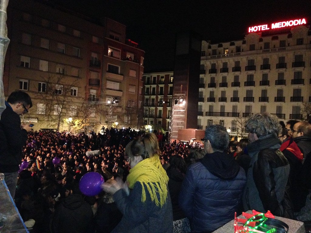 On si hi hagué festa fou a la explanada del Museu Reina Sofia de Madrid. Els militants de Podemos esperaren els seus líders per festejar uns resultats que el col·loquen com a força decisiva. Passada la 1 de la matinada Juan Carlos Monedero cantava el “Madrid que bien resistes”, amb un cor de milers de persones que entonaren el “Sí se puede”. Pablo Iglesias fou dels primers en fer una lectura dels resultats i a la seua primera intervenció va fer diverses al·lusions a l’Estat plurinacional. “Mai més una Espanya sense els seus pobles i la seua gent”, declarava el líder del partit morat.